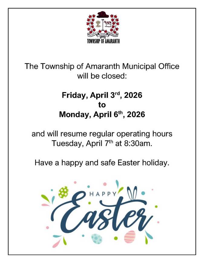 The Township of Amaranth Municipal Office will be closed from Friday, April 3rd, 2026 to Monday, April 6th, 2026 and will resume regular operating hours Tuesday, April 7th at 8:30am.