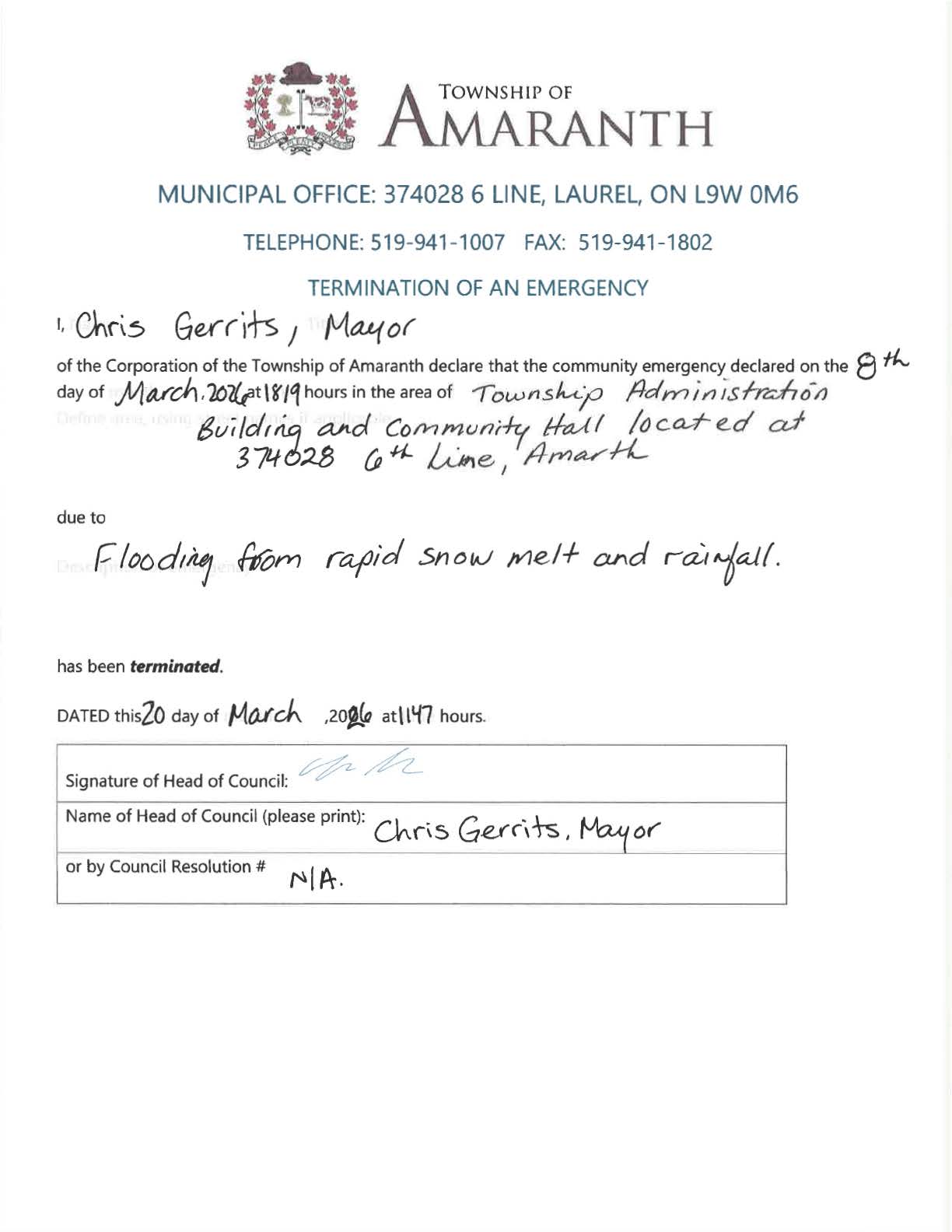 The emergency declared on March 8, 2026 has now been terminated. The office has re-opened and resumed regular business.