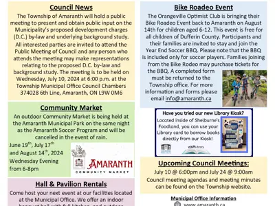 On Wednesday, July 10, 2024 the Council of the Township of Amaranth will hold a public meeting, pursuant to section 12 of the Development Charges Act, 1997, as amended, to present and obtain public input on the Municipality’s proposed development charges (D.C.) by-law and underlying background study.