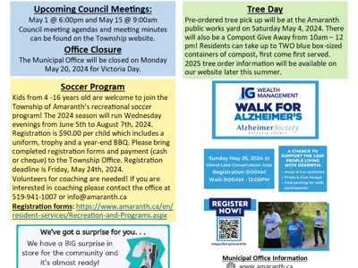The Township of Amaranth Municipal Office will be closed on Monday, May 20th, 2024 in observance of the Victoria Day holiday.