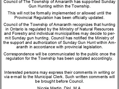 Council of The Township of Amaranth has supported Sunday Gun Hunting within the Township. This will not be formally implemented or allowed until the Provincial Regulation has been officially updated.