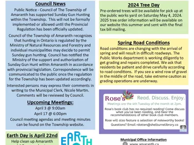 The Township of Amaranth Municipal Office will be closed from Friday, March 29th, 2024 to Monday, April 1st, 2024 and will resume regular operating hours Tuesday, April 2nd at 8:30am.